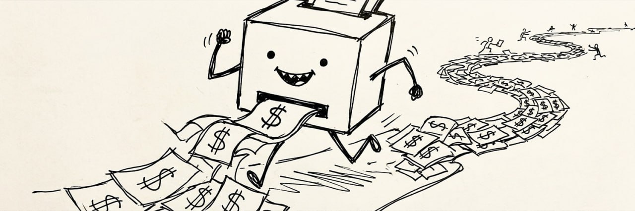 A memecoin drawn in pen, taped to the internet, and set loose on the charts. No roadmap. No utility. Just a happy little printer doing what printers do.